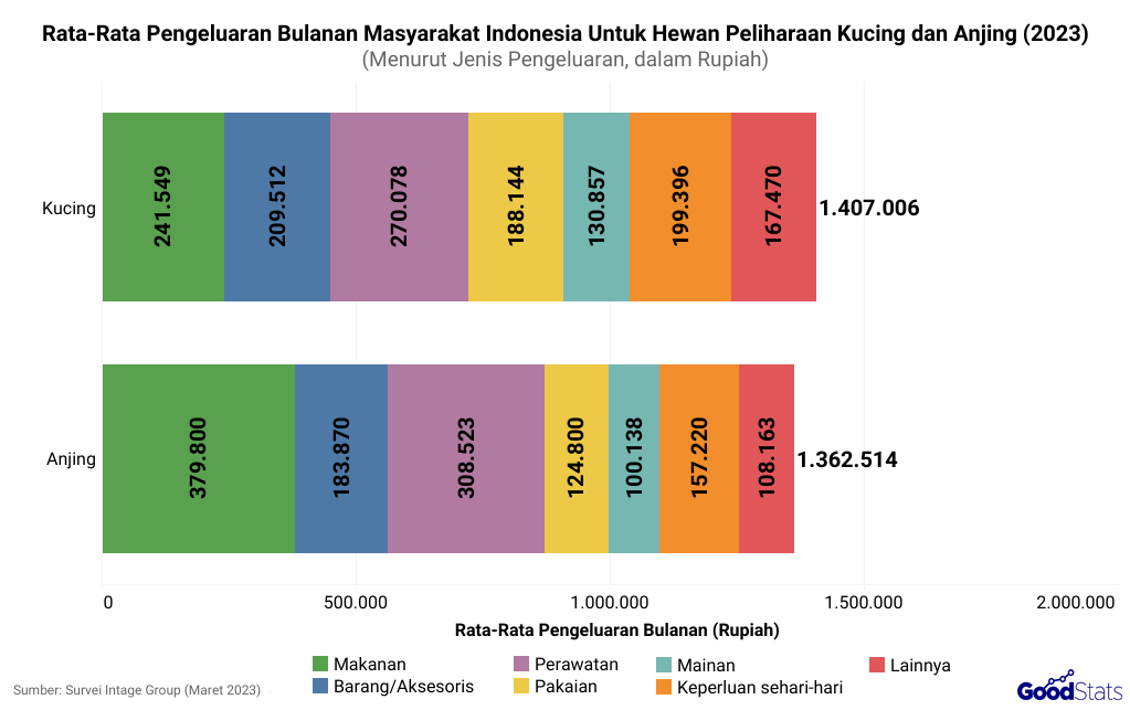 Data dari Intage Group yang melakukan survei di beberapa negara, termasuk Indonesia, menunjukkan bahwa pemilik anjing dan kucing di Indonesia rata-rata menghabiskan sekitar Rp1,3–1,4 juta per bulan untuk hewan peliharaan mereka.